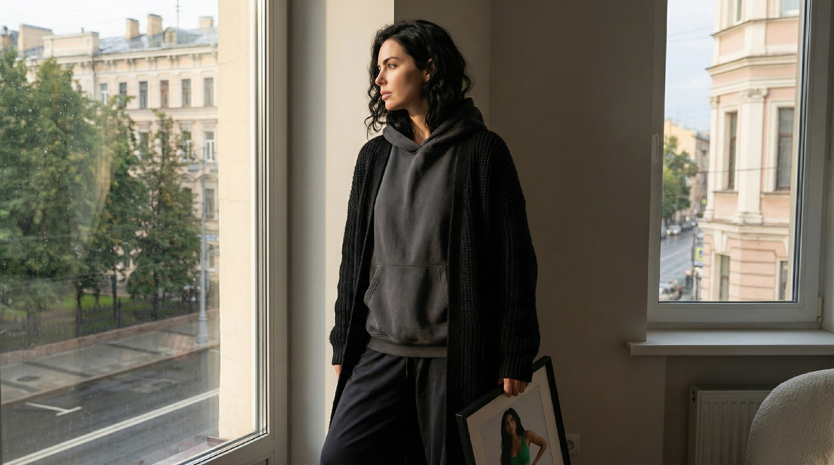 Результат предсказуем. Женщина начинает одеваться вокруг своих «недостатков». Выбирает вещи, которые скрывают, а не показывают. Балахоны, длинные кардиганы, свободные рубашки поверх всего, тёмные цвета с ног до головы.