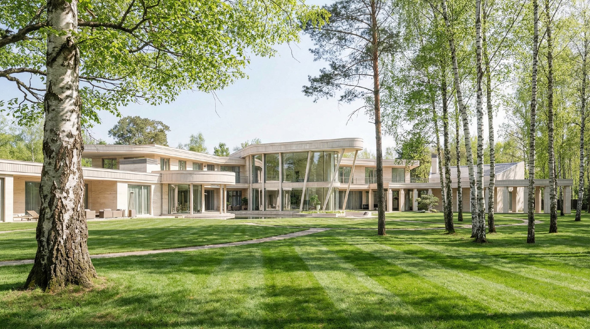 Органическая архитектура люкс-класса — это уже не просто большой дом с панорамными окнами. Это философия, в которой здание не спорит с природой, а становится её продолжением. Именно такой подход читается в этом проекте: резиденция буквально «врастает» в берёзовый лес, сохраняя ощущение воздуха, света и тишины. Главная особенность проекта — мягкая, текучая пластика. Здесь нет жёстких, агрессивных линий: скруглённые углы, плавные карнизы, вытянутые горизонтали и тонкие колонны создают впечатление, будто архитектура повторяет ритм деревьев и ландшафта. Дом выглядит масштабно, но не тяжело — он словно парит среди стволов и зелёных лужаек. Важную роль играет материал. Светлый камень, стекло и натуральные оттенки фасадов поддерживают природную палитру участка. Огромные витражи стирают границу между интерьером и экстерьером: лес становится частью внутреннего пространства, а отражения воды и листвы добавляют ощущение курортной приватности. Ещё один признак люкса нового поколения — не демонс