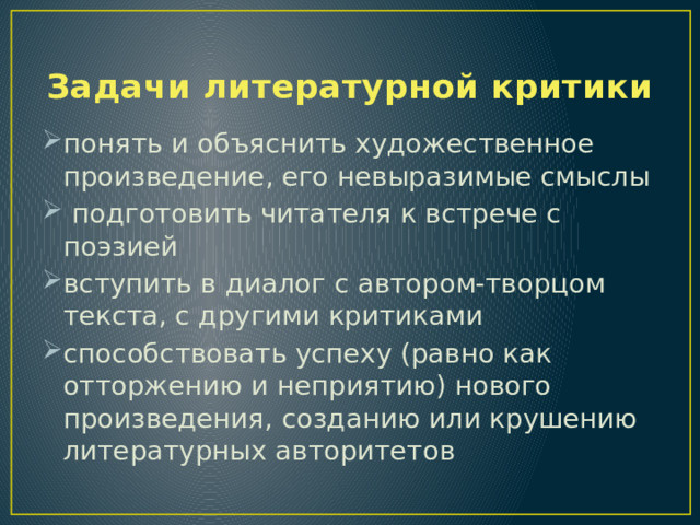 "Критика — наука открывать красоты и недостатки в произведениях искусств и литературы" (А. С. Пушкин. Статья "О критике", 1830).