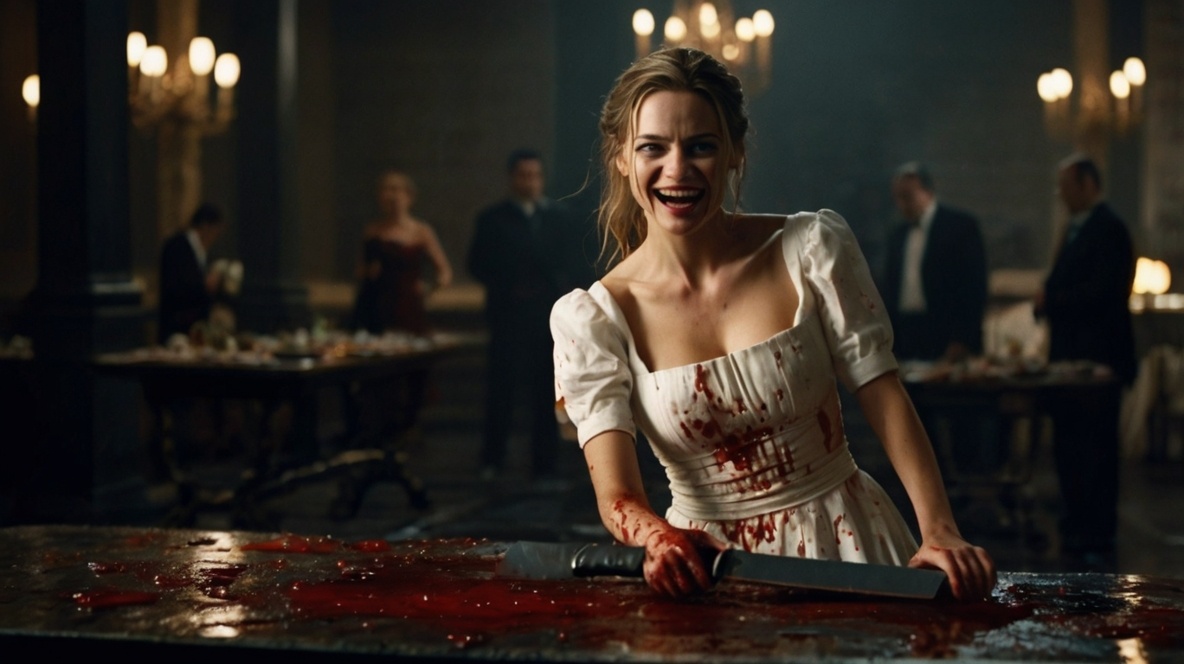 В этот момент в зал вбежал официант с шампанским. Увидел два трупа, лом, нож и Веру, которая прихорашивалась перед маленьким зеркальцем.