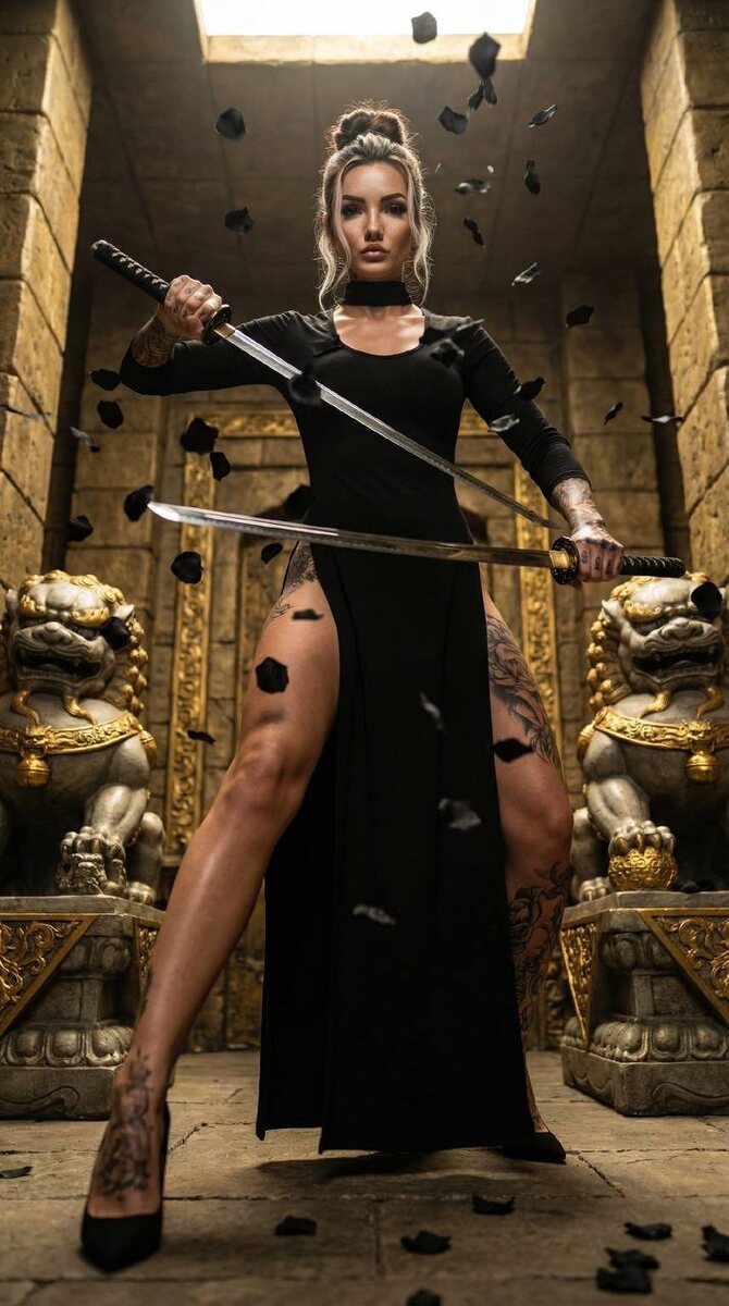 🫣 Возьми лицо с фотореференса, сохрани максимально его черты и натуральную текстуру кожи. Средний план . Экстремальный ракурс снизу: широкоугольная перспектива снизу камера расположена прямо на уровне пола, съёмка строго снизу вверх. Перспектива начинается от ног, ноги находятся максимально близко к камере и доминируют в переднем плане. Сильное перспективное искажение, удлинённые пропорции ног и тела. Точка съёмки — ground level. Чётко выраженный upward angle, эффект «съёмки с земли». Девушка стоит уверенно, позирует, динамичная поза. На ней длинное черное платье с высоким разрезом, до середины бедра,подчёркивающим ноги. Платье с длинными рукавами. Чокер на шее. В руках две катаны, по одной в каждой руке, движение — разрезает падающие лепестки черной розы. На девушке много татуировок. Прическа: изысканный собранный пучок, с выбивающимися обесцвеченными прядями у лица,аккуратная укладка. Сцена: каменное пространство с богатой фактурой, по бокам два восточных льва (каменные, детализи