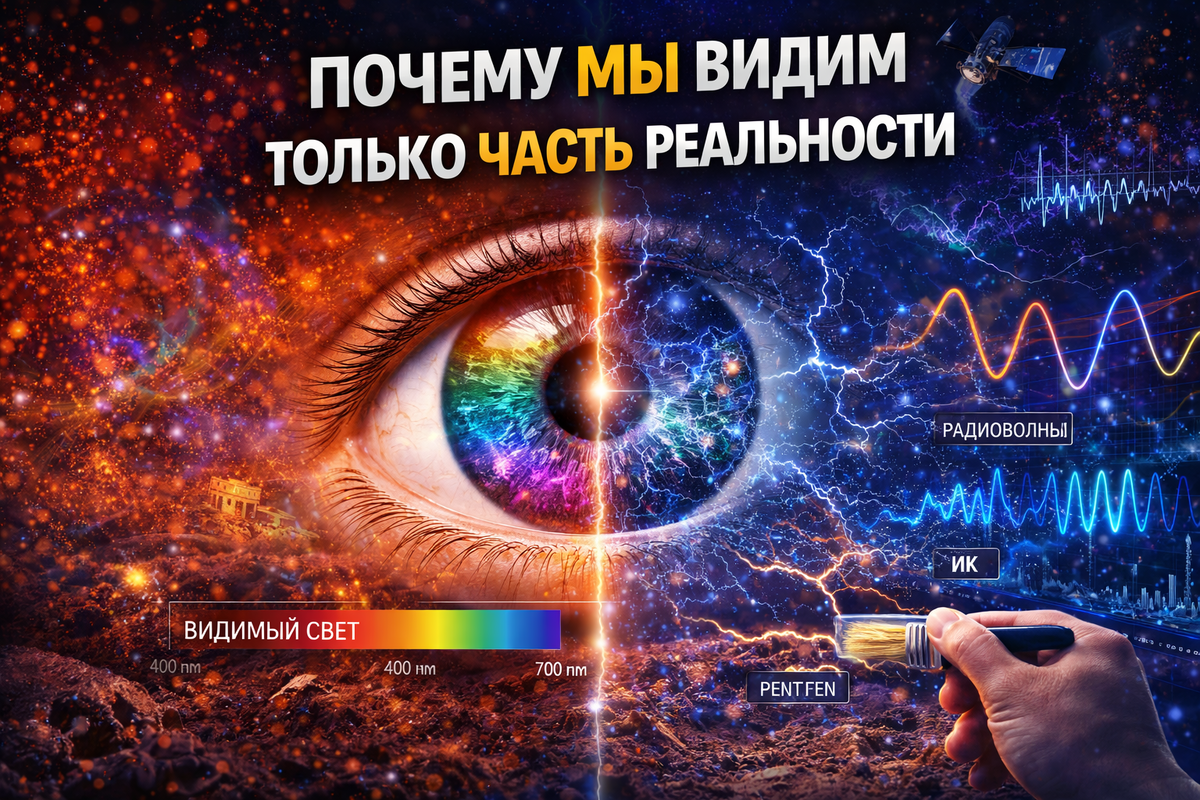 Кажется, что мы видим мир таким, какой он есть. Но это иллюзия. На самом деле человек воспринимает лишь узкий фрагмент реальности. И дело не в философии. Это жесткий научный факт. Начнем с простого. Свет - это электромагнитные волны. Но человеческий глаз воспринимает только небольшой диапазон. Примерно: Все остальное: мы просто не видим. А это огромная часть реальности. Наше зрение: То есть даже "видимый мир" мы воспринимаем с искажениями. Глаз - это только датчик. Все, что мы видим, формируется в мозге. И мозг: Например: Мы видим не мир. Мы видим интерпретацию. Наше восприятие времени: Мозг может: Реальность непрерывна. А восприятие - нет. У нас всего несколько каналов: Но в реальности есть гораздо больше параметров: Мы их не ощущаем напрямую. Интересный факт. Другие виды воспринимают реальность иначе: Это значит: реальность одна. Но "картинок" много. Мозг не стремится показать правду. Он стремится показать полезную информацию. Например: Это эволюционный фильтр. На уровне микромира: Н