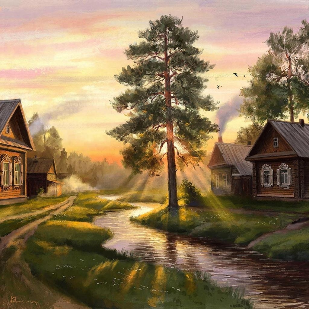 Описание работы: Рисунок, созданный по мотивам стихотворения "Утро" Н. Рубцова, передает атмосферу тихого летнего утра в Вологодской деревне. На картине изображен сосновый лес, сквозь который нежно пробиваются лучи восходящего солнца, окрашивая крону деревьев в золотые и оран