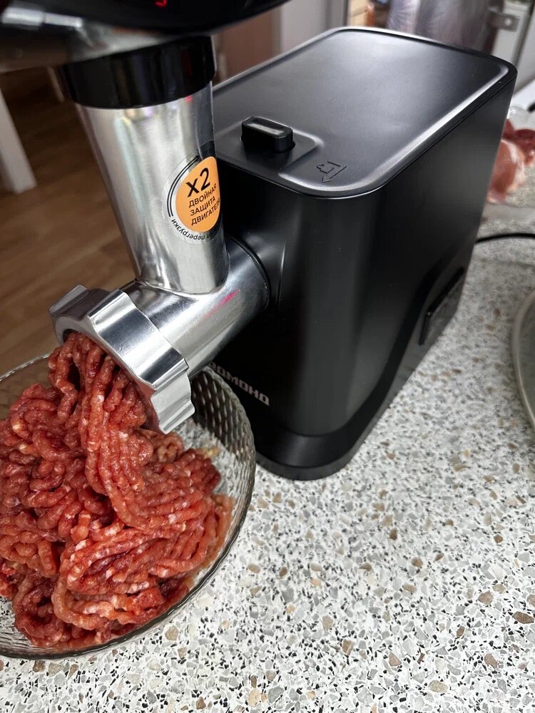 Redmond RMG-1239-6 перемалывает мясо быстро, без усилий. Не нужно толкать, не нужно ждать, не нужно переживать, что мотор сгорит. Загрузил — нажал — получил фарш.