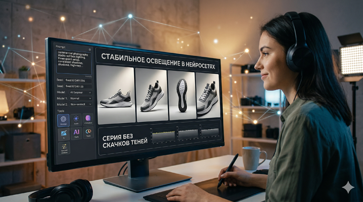 В коммерческой генерации и при создании каталогов для брендов одной удачной картинки мало. Главная боль при работе с ИИ — заставить алгоритм выдать серию кадров с абсолютно одинаковым светом. Если тени и блики скачут от изображения к изображению, такой материал не годится для профессионального использования. Вот три рабочих метода, как стабилизировать свет при пакетной генерации: 1. Жесткая фиксация схемы света в промпте