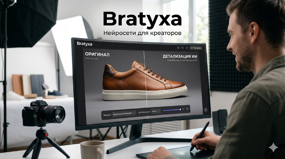 2. Креативный апскейл. Если материалам в кадре не хватает фактуры (ткань выглядит пластиковой), применяются алгоритмы, перерисовывающие мелкие элементы. В интерфейсе Братухи можно прогонять исходник через разные модели улучшения, не покидая рабочее окно.