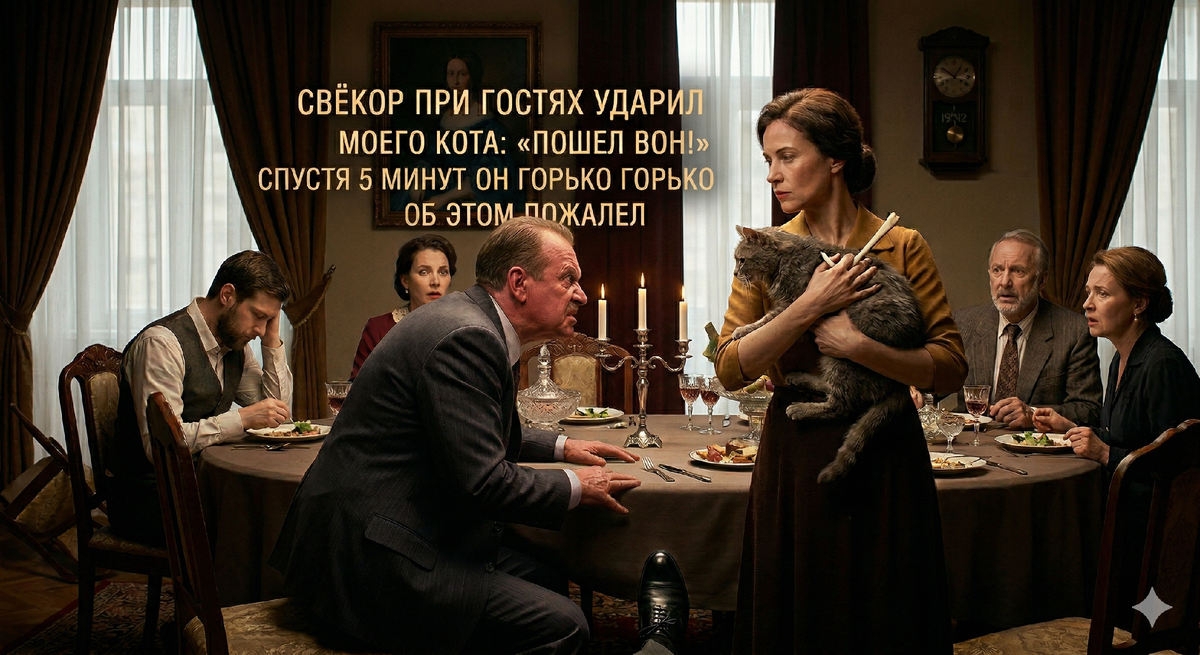 Свекор застыл. Спустя пять минут после удара он понял, что проиграл по всем фронтам. Он унизился перед гостями, он попросил прощения у кота, и всё это было зря. Он потерял не картину. Он потерял власть над ситуацией.