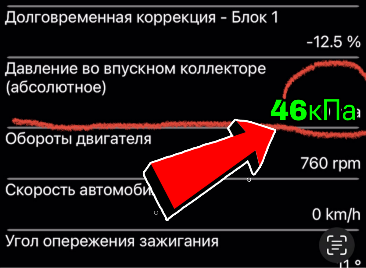 - Приговор: Если ты видишь на прогретом моторе без нагрузки 40, 45 или 50 кПа — всё. Компрессия падает, кольца устали, фазы ГРМ сбиты (растянута цепь) или мотор сосёт лишний воздух через дыру во впуске. Двигатель теряет силы и жрёт топливо.
