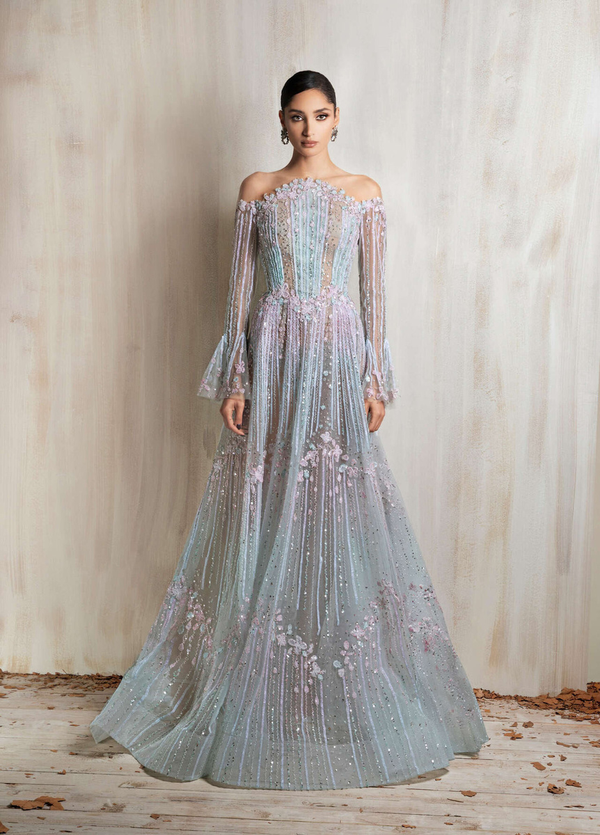 Это коллекция, в которой много света, изящества и того особого настроения, когда платье выглядит не просто нарядом, а почти произведением искусства. Здесь все построено на красоте силуэта, мягком сиянии тканей, тонкой вышивке и оттенках, от которых сложно отвести взгляд. Нежные голубые, пудровые, молочные, дымчатые, глубокие темные и благородные теплые тона сменяют друг друга очень красиво. Каждый образ будто создает свое собственное настроение. В одних платьях чувствуется легкость и романтика.