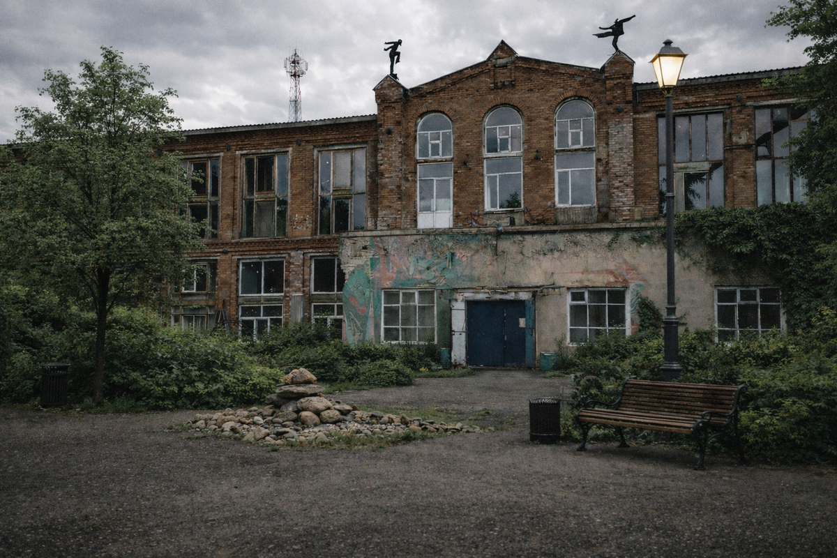 Здесь на площади в 14 000 квадратных метров звук бензопилы из столярной мастерской смешивается с репетицией джазового коллектива. Огромное краснокирпичное здание конца XIX века стоит в лесу так, будто его здесь забыли при эвакуации крупного завода. Но вместо станков здесь теперь мольберты, а вместо рабочих — люди, променявшие московский офис на жизнь в коммуне. Я попал сюда почти случайно, когда искал повод свернуть с шумной Егорьевки в сторону леса. В 95 километрах от Москвы, за селом Ильинский Погост, навигатор заставил меня притормозить у массивных ворот. За ними открылся вид, который обычно ждёшь увидеть в фильмах про заброшенные лечебницы: монументальное здание, зажатое между вековыми соснами и берегом реки Гуслица. Именно здесь когда-то была ткацкая мануфактура, потом — что-то вроде профилактория, а затем — пустота. Пять лет назад здание напоминало декорацию к постапокалипсису, пока сюда не зашли первые художники. *Но это было только начало.* Первое, что бьёт в нос при входе — гу