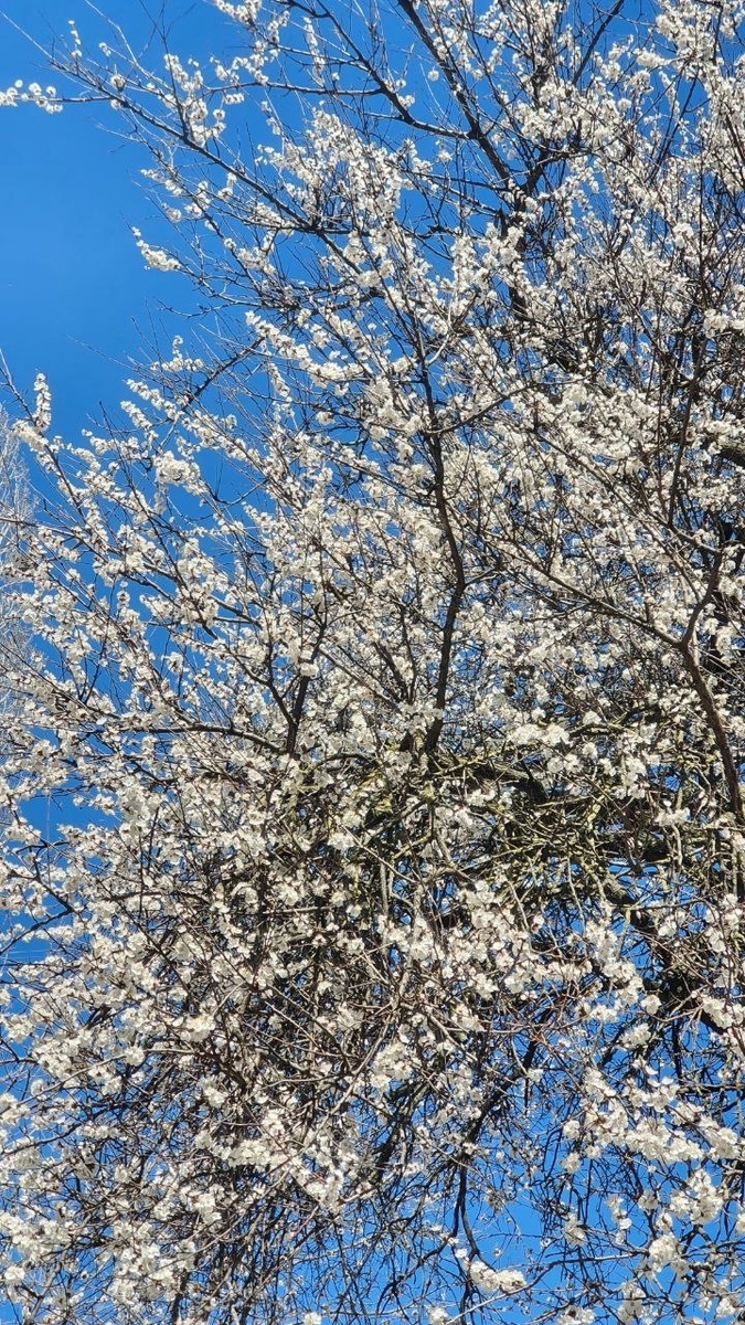 В соседнем дворе уже четыре дня цветёт старая абрикоса.