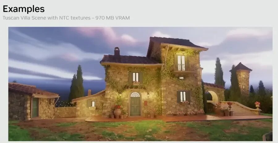 Nvidia продемонстрировала две демонстрации: нейронное сжатие текстур и нейронные материалы. Nvidia показала, как NTC может быть использован для сжатия сцены, которая ранее требовала 6,5 ГБ видеопамяти, всего до 970 МБ с помощью NTC. Менее ясно, что Nvidia делает с нейронными материалами, но похоже, что компания пытается сообщить ГП, каковы свойства материала на самом деле, а затем сжать эти инструкции. По данным Nvidia, графический процессор будет, по сути, конструировать материал, ускоряя процесс в 1,4–7,7 раза.