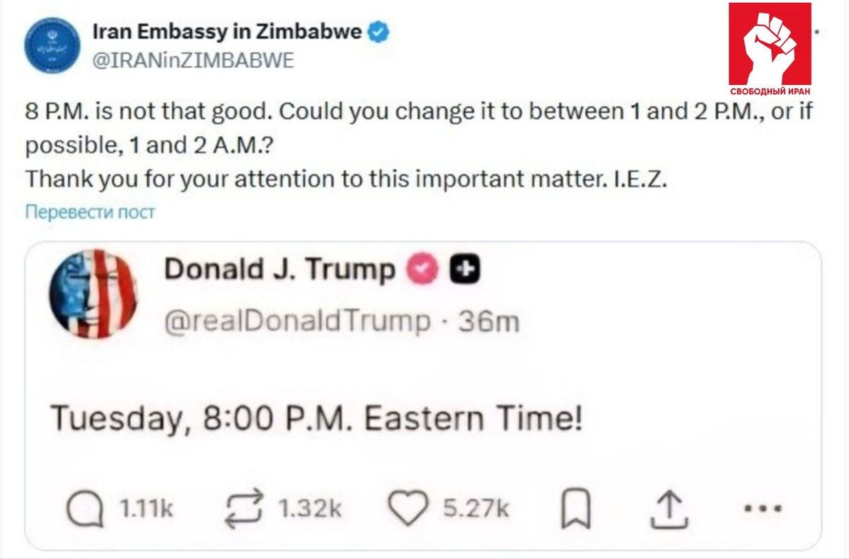 😂 Посольство Ирана в 🇿🇼 Зимбабве язвительно прокомментировало угрозу Дональда Трампа устроить Ирану адскую ночь, предложив перенести это неудобное время на 13:00–14:00 или 01:00–02:00. Без лишней дипломатии, но с хорошим уколом по нервам Вашингтона. Подпишитесь на канал