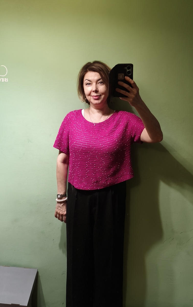 Узор самый простой, один ряд все столбики с накидом, второй ряд столбик с накидом, одна воздушная петля. Я вязала по кругу поворотными рядами. На спине связан азиатский росток, вытачку из-за достаточной ширины решила не делать.