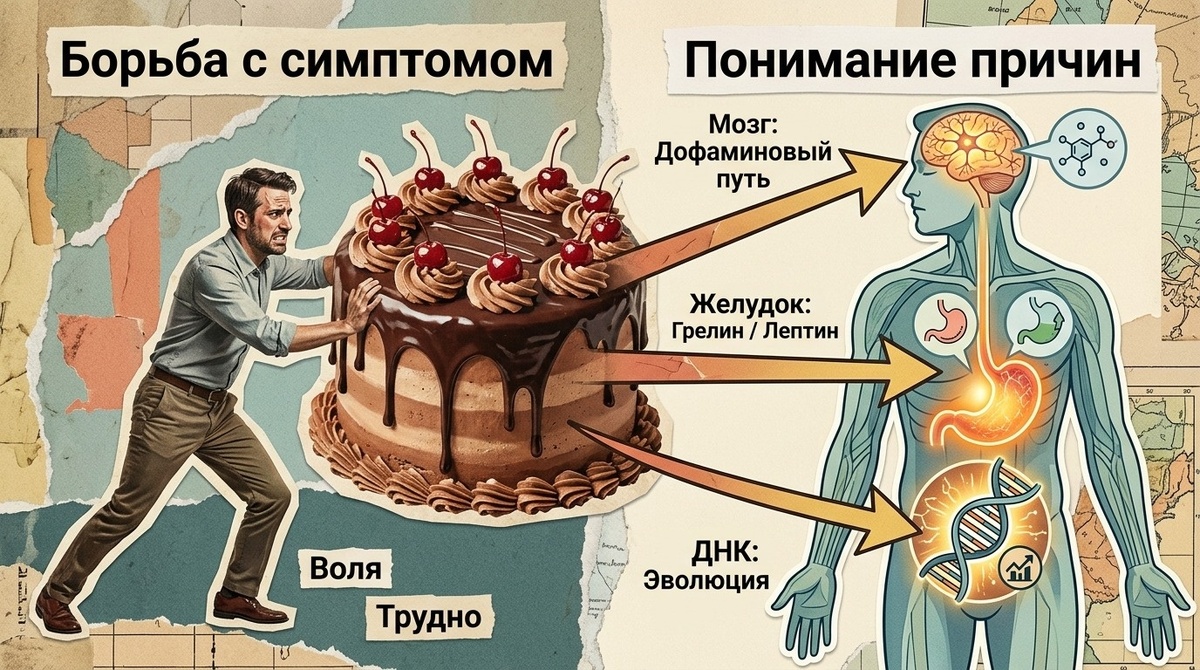 Вы съели пол торта и ненавидите себя за слабость. Держались три дня, а потом вечерний «жор» смел все планы. Знакомое состояние? В голове стучит мысль: «Я тряпка, у меня нет силы воли». А что, если ваша «слабость» — это работа идеально отлаженного механизма выживания, который просто не понимает, что на дворе 2026 год?