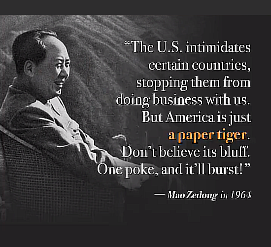 Причём, судя по его словесному запасу, я лично очень сомневаюсь, что он понимает значение этого выражения. А у этой метафоры есть своя родина и своя точка отсчёта… если интересно, то читайте, почему «тигр» и почему «бумажный», и кому было адресовано это сравнение. Произошло всё в далёком 1964 году Великий кормчий Китая (Мао Цзэдун) выдал: «США запугивают некоторые страны, препятствуя им вести дела с нами. Но Америка – всего лишь бумажный тигр. Они блефуют. Один толчок – и он лопнет!» Смысл этого послания заключается в несоответствие между заявляемыми возможностями государства и его фактическим влиянием или ресурсами… Но, почему именно Америка и почему «бумажный тигр»? Здесь надо понимать, что один из образов Запада в китайской метафизике (КМ) является тигр, а именн