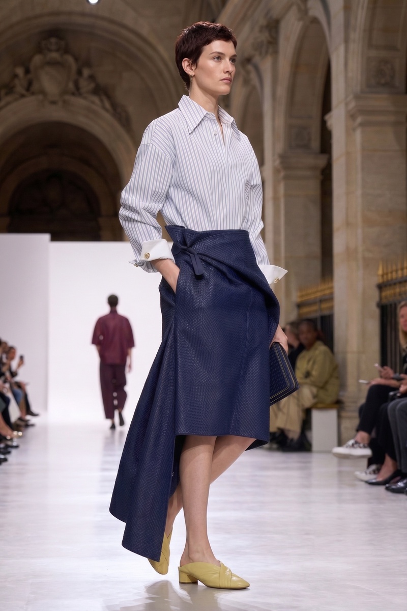 Текстурированная тёмно-синяя юбка с крупным бантом сбоку создаёт диагональ, которая визуально «ломает» горизонталь бёдер. Острый угол подола тянет взгляд вниз, удлиняя ноги без каблуков. Рубашка в тонкую полоску с закатанными рукавами добавляет дневной непринуждённости, не перегружая образ.