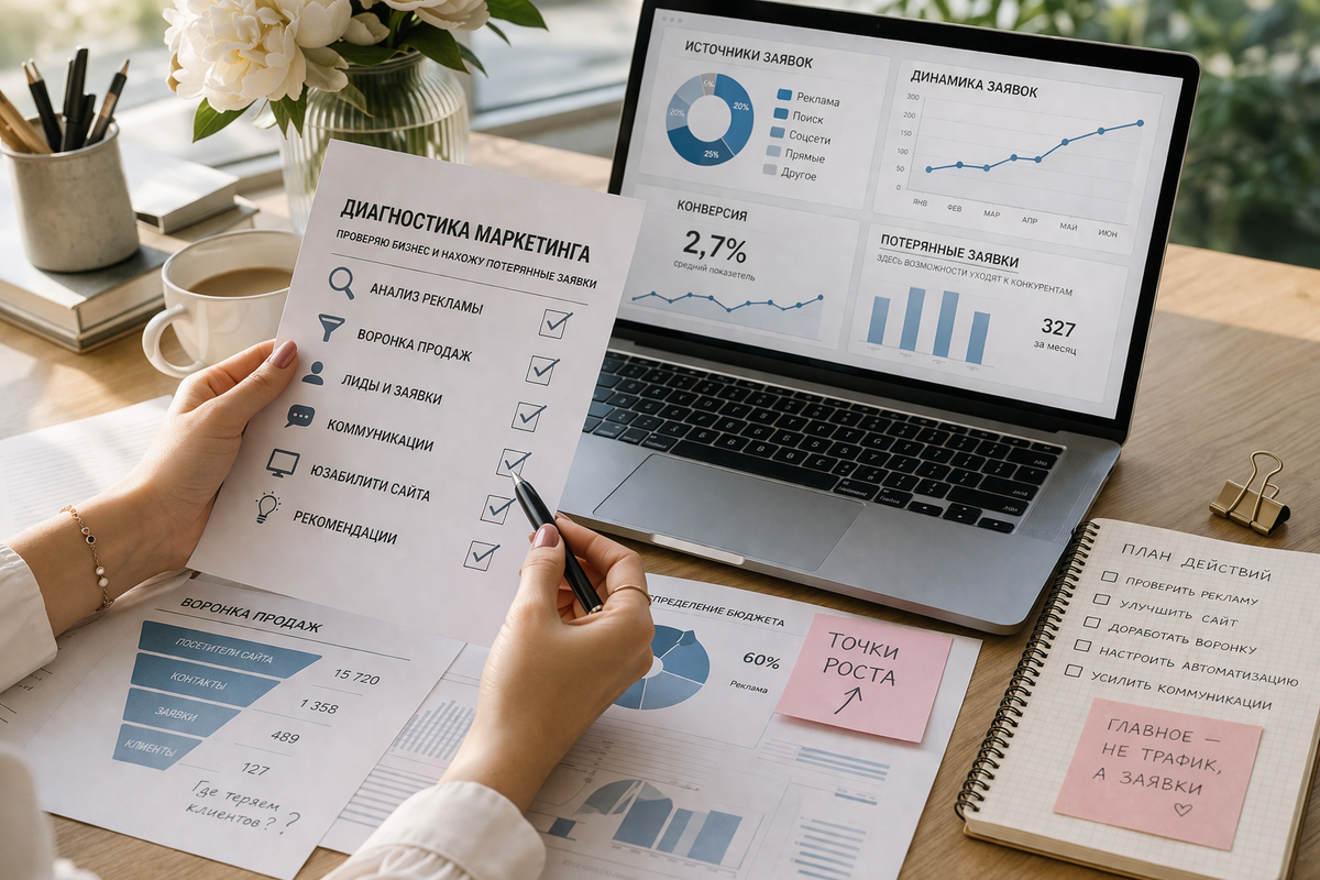 Я не обещаю, что после диагностики у вас сразу пойдут заявки. Обещаю другое: вы будете точно знать, где у вас болит, сколько денег вы теряете и что делать дальше.