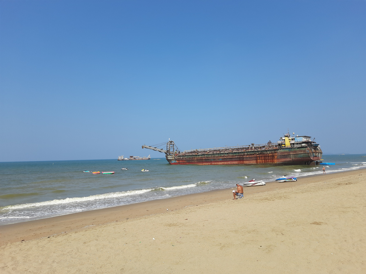На пляже увидели как близко подошёл к берегу корабль.