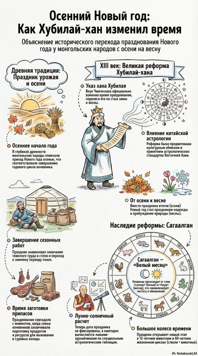 В глубокой древности монгольские народы отмечали приход Нового года осенью. Праздник знаменовал окончание трудового цикла кочевника, завершение сезонных работ в степи и заготовку припасов для выживания в суровые холода. Однако в XIII веке внук Чингисхана, Хубилай-хан, провел великую реформу времени. Под влиянием восточноазиатских астрологических стандартов празднование было официально перенесено на стык зимы и весны. Так возник Сагаалган (Белый месяц) — праздник надежды и пробуждения природы. С этого момента дата Нового года перестала быть фиксированной; теперь ее ежегодно вычисляют ламы-зурхайчины по специальным лунно-солнечным таблицам.