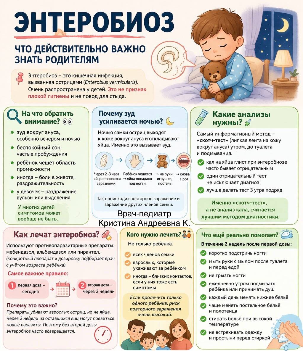 👇 «У ребёнка чешется попа ночью» — одна из самых частых фраз , которую я слышу от родителей. И чаще всего речь идёт именно об энтеробиозе — заражении острицами. ‼️: энтеробиоз — это не повод для стыда. Это очень распространённая инфекция у детей дошкольного и младшего школьного возраста. На что обратить внимание? 👀 🔹зуд вокруг ануса, особенно вечером и ночью 🔹беспокойный сон, частые пробуждения 🔹ребёнок чешет область промежности 🔹иногда — боли в животе, раздражительность, плаксивость 🔹у девочек возможно раздражение вульвы или выделения. У многих детей симптомов может вообще не быть. Почему зуд усиливается ночью? 👶 Ночью самки остриц выходят к коже вокруг ануса и откладывают яйца. Именно это вызывает зуд. Через 2–3 часа яйца становятся заразными ⏰ 👉Ребёнок чешется → яйца попадают под ногти → на руки, игрушки, постель → снова в рот 🙌 Так происходит повторное заражение и заражение других членов семьи. Замкнутый круг. Как обнаружить ? 🧪 Самый информативный метод — «скотч-т