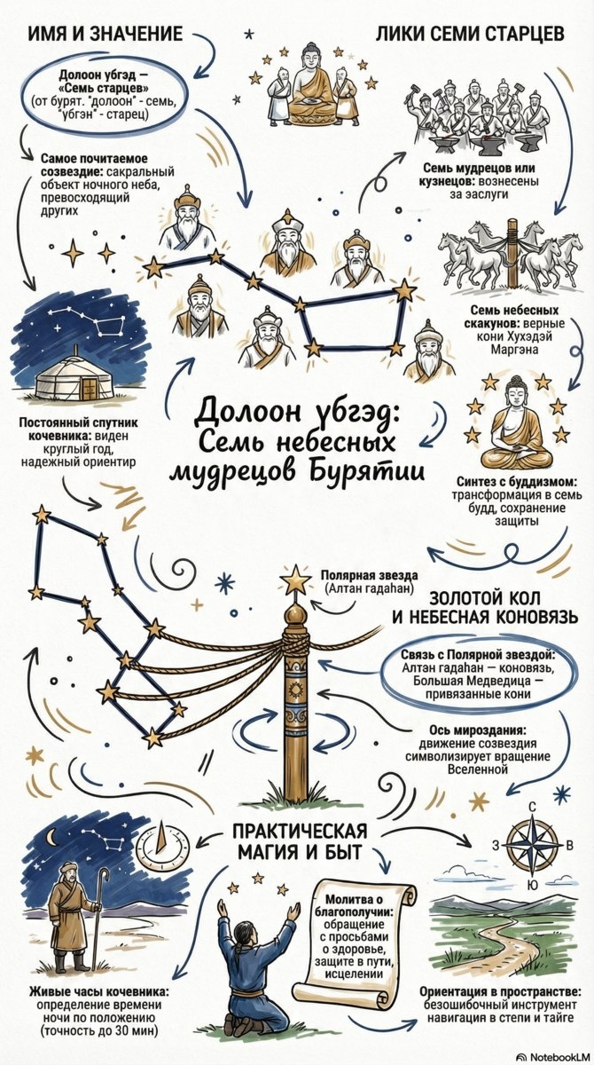 Большая Медведица — самое почитаемое созвездие бурят, известное как Долоон үбгэд или Семь старцев. В разных преданиях это семь мудрецов, кузнецов или небесных скакунов охотника Хухэдэя Мэргэна. Созвездие является постоянным спутником кочевника, видимым круглый год. Связь с Полярной звездой (Алтан гадаhан) описывается через образ небесной коновязи: звезды Медведицы воспринимаются как привязанные кони, чье движение символизирует вращение Вселенной. С распространением буддизма произошел синтез традиций, и старцы стали ассоциироваться с семью буддами. К Семи старцам обращаются с молитвами о благополучии, долголетии и исцелении. Для бурят это созвездие служит живыми часами и инструментом навигации в открытой степи и тайге.