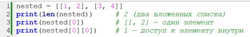 Многие начинающие программисты сталкиваются с неожиданным поведением при работе со вложенными списками в Python. Главное правило, которое нужно запомнить: вложенный список считается одним элементом родительского списка. Рассмотрим простой пример: my_list = [1, 2, [3, 4, 5], 6] print(len(my_list)) # 4 Несмотря на то, что внутри есть три числа и один список из трёх элементов, функция len() возвращает 4. Внешний список «видит» вложенный список как единое целое — как один объект, стоящий на своей позиции. Такое поведение влияет на: Понимание этого принципа поможет избежать типичных ошибок и эффективнее работать с многомерными структурами данных в Python. На этом всё. Подписывайтесь на канал, чтобы ничего не пропустить.