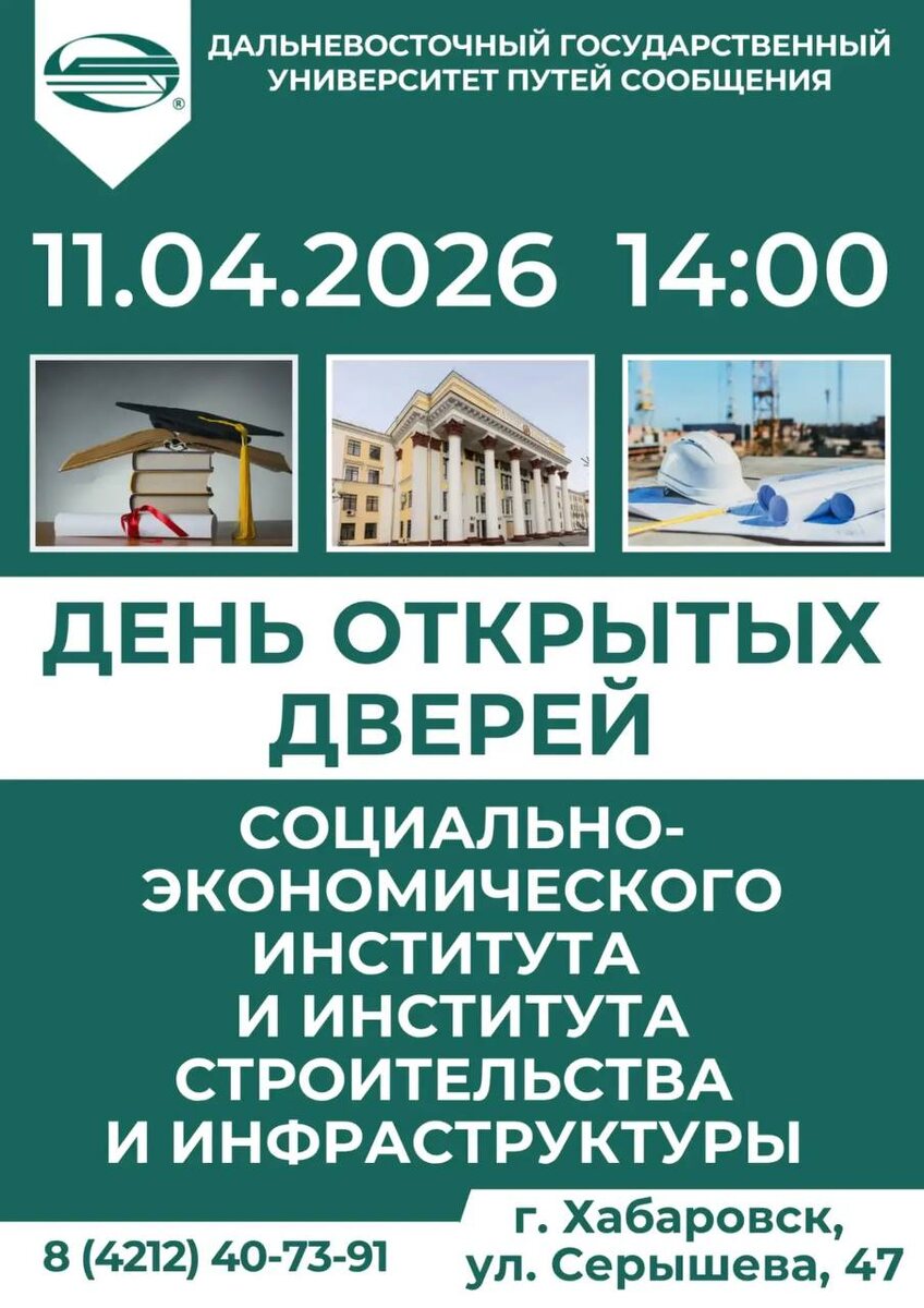 ! Социально-экономический институт и Институт строительства и инфраструктуры приглашают школьников познакомиться с университетом. Что Вас ждёт: ✔️ Знакомство с директорами институтов ✔️ Расскажем о специальностях и направлениях ✔️ Экскурсия по одному из крупнейших вузов Дальнего Востока ⏳ 11 апреля 2026 14:00 📍ул. Серышева, 47 (Сбор в холле главного корпуса) 📞 8 (4212) 407391