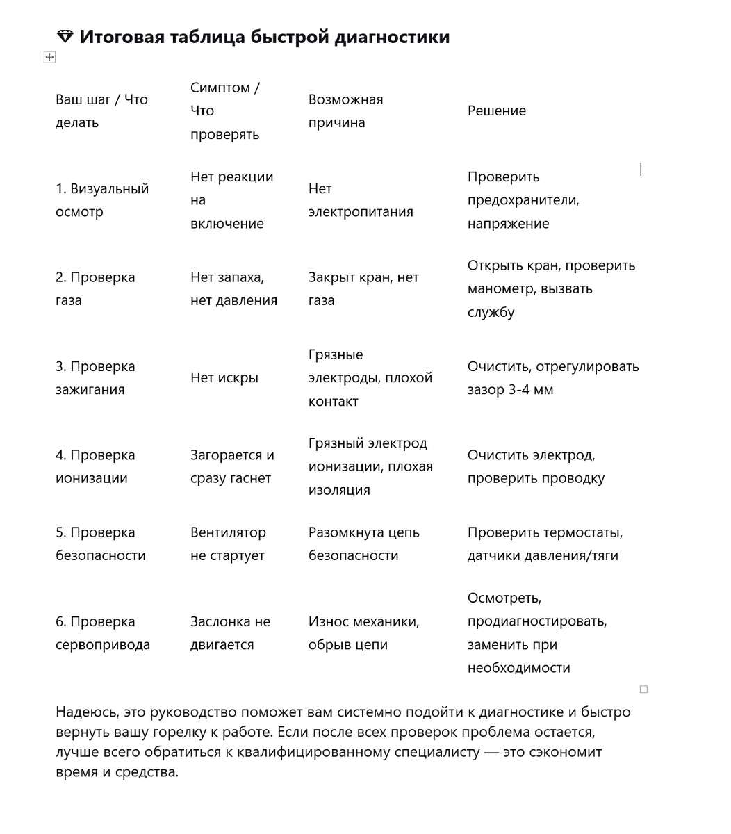 Это уже более сложный уровень. Если предыдущие шаги не помогли, дело может быть в «мозгах» или «мышцах» горелки.