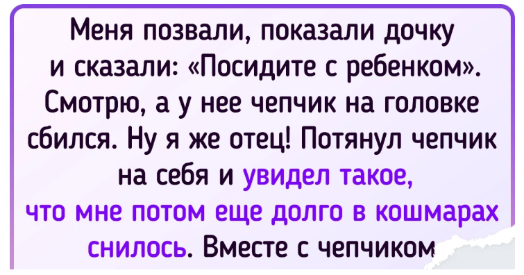 - Решил присутствовать на родах. Пока была вся подготовка, я находился рядом с женой: подбадривал ее, помогал по мере сил. А вот когда начались сами роды, она меня выгнала, да я и не сопротивлялся. Потом меня позвали, показали дочку и сказали: «Посидите с ребенком». Смотрю, а у нее чепчик на головке сбился. Ну я же отец! Потянул чепчик на себя и увидел такое, что мне потом еще долго в кошмарах снилось. Вместе с чепчиком будто и кости на голове начали двигаться. Я вернул все как было и перестал вообще шевелиться. Уже потом узнал, что это норма. © Kaa1980
