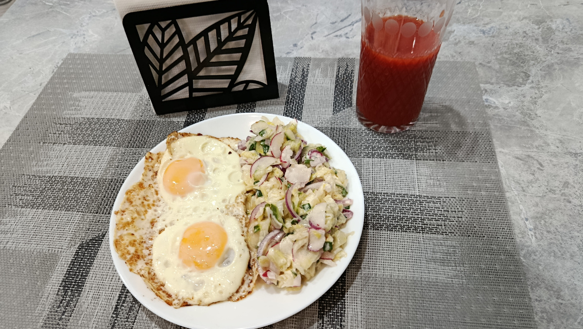Все мои завтраки,как правило,простые,быстрые и без особых заморочек. И сегодня,как раз такой: 2 яйца (100 г) , и салат из пекинской капусты , редиса ,красного и зелёного лука . Заправила небольшим количеством сметаны с солью и специями.Вес салата тоже 100 г. Налила приблизительно 120 г. домашнего томатного сока без соли и сахара. Помидоры в прошлом году были отменные,так,что сок в натуральном виде получился очень вкусным. И вес моего завтрака получился 320 г.