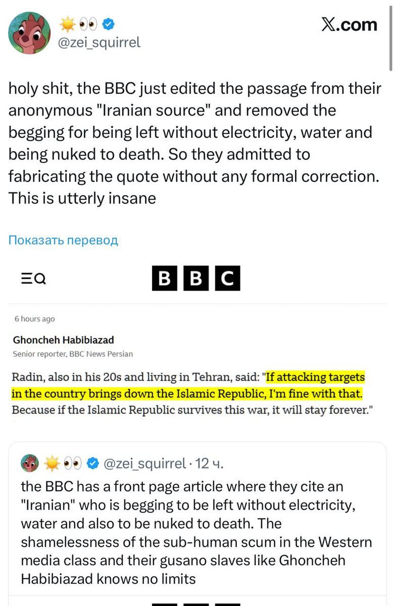 Журналистка BBC с непроизносимым именем Гончех Хабибиазад вставила в текст про Иран выдуманную цитату о том, что 20-летний иранец просит разбомбить его ядеркой, а затем, после того, как на нее обратили внимание в X, скорректировала текст. Автора замечания журналистка заблокировала. Было: Радин, также в возрасте около 20 лет и живущий в Тегеране, говорит: «Что касается ударов по энергетической инфраструктуре, применения атомной бомбы или полного разрушения Ирана — моя честная реакция такова, что меня устраивает всё из этого списка». Стало: Радин, также находящийся в возрасте около 20 лет и живущий в Тегеране, говорит: «Если удары по целям в стране приведут к падению Исламской Республики, меня это устраивает. Потому что если Исламская Республика переживёт эту войну, она останется навсегда». 📬 Беспощадный пиарщик в MAX. БП онлайн в MAX. Любаест в MAX.