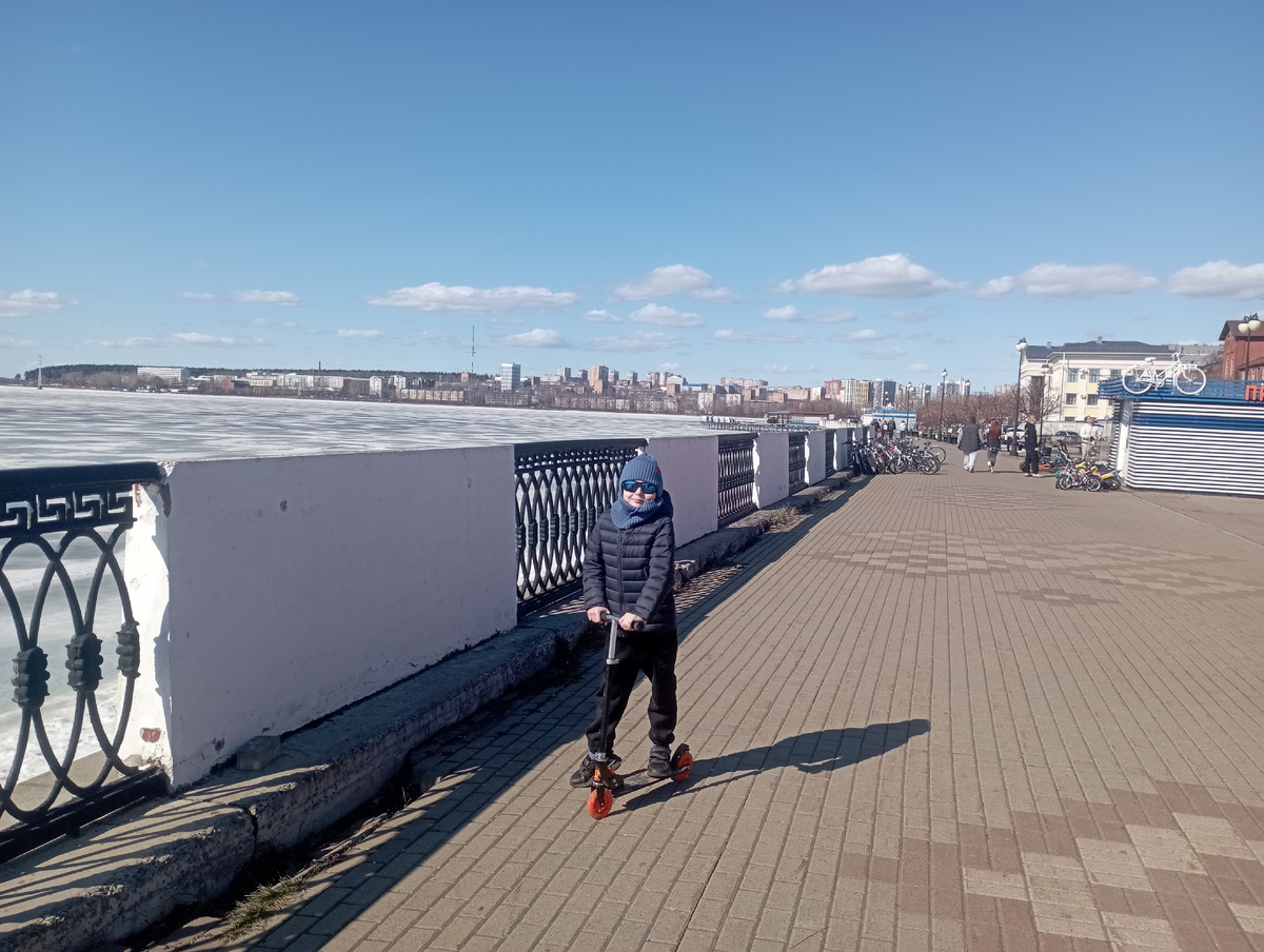 В середине весны в Ижевске ещё не так много мест, где можно долго и неторопливо гулять, кататься на велосипеде. Снег растаял ещё не везде, но вот на набережной пруда как раз сухо. Уже работают пункты проката (домик с велосипедом на крыше).
