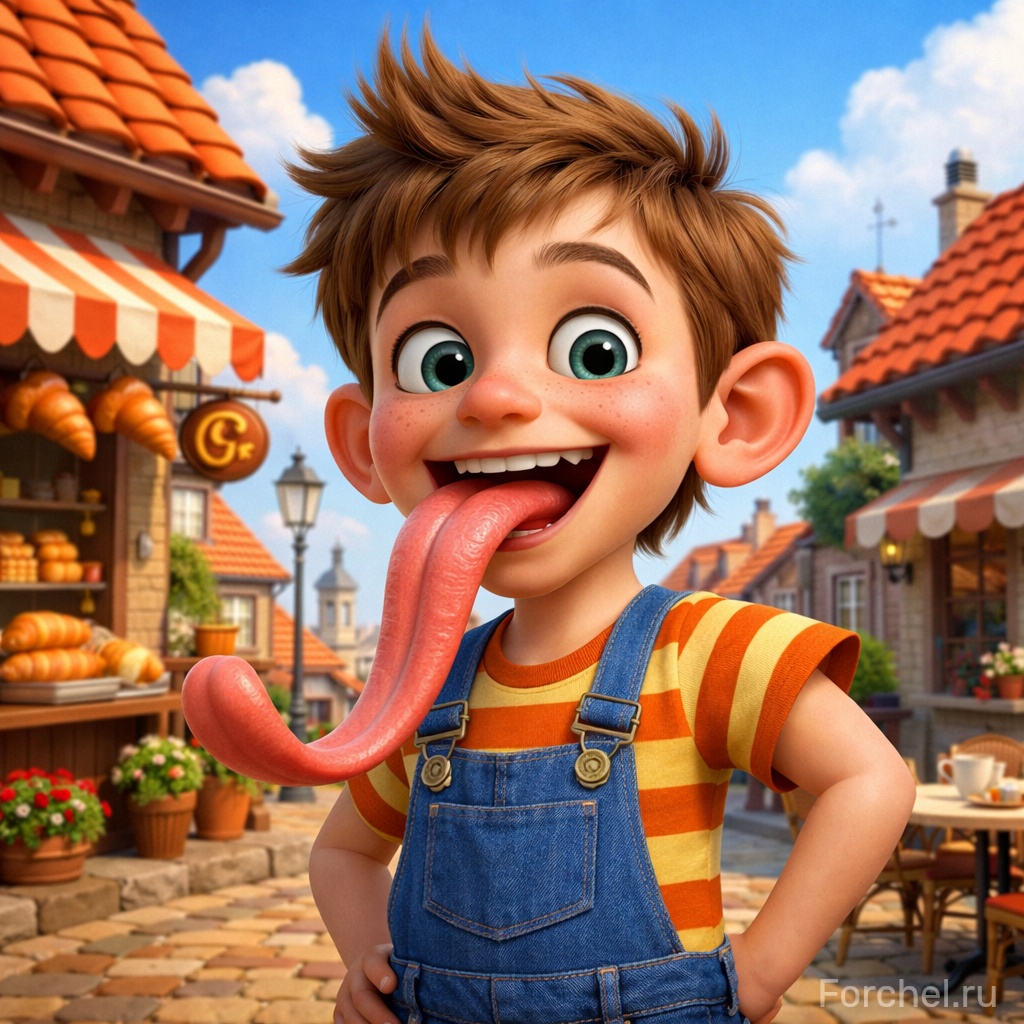 В одном уютном городке, где крыши домов были покрыты красной черепицей, а на улицах всегда пахло свежей выпечкой, жил мальчик по имени Ваня. У него была одна особенность — очень длинный язык. Не в переносном смысле, а в самом настоящем: его язык мог достать до носа, до подбородка и даже до ушей.