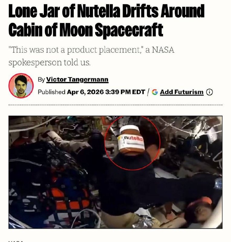 Кто-то из астронавтов текущей лунной миссии взял с собой банку нутеллы. Так как вся миссия теперь транслируется чуть ли не онлайн – нашелся кадр в котором это банка просто пролетает крупным планом . NASA даже пришлось выпустить опровержение того, что это реклама, тем самым только подогреть интерес.  У кого-то большая пиар удача сегодня😂