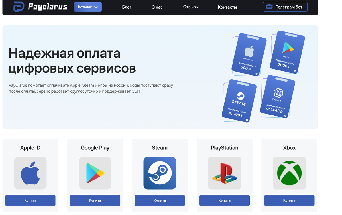 PayClarus — это онлайн-сервис, который специализируется на продаже цифровых товаров и пополнении популярных платформ. На сайте можно приобрести подарочные карты, пополнить баланс сервисов вроде Google Play, Steam и других цифровых продуктов Проект позиционируется как удобное решение для пользователей, которым нужен быстрый доступ к цифровому контенту без лишних сложностей. Основной акцент делается на скорости, автоматизации и доступности различных способов оплаты. Механика работы PayClarus достаточно простая и понятная. Пользователь: Код обычно отображается сразу на экране и дополнительно отправляется на электронную почту. (PayClarus) В большинстве случаев доставка происходит мгновенно, хотя иногда возможны небольшие задержки, например при нагрузке на платёжные системы. Оплата поддерживается разными способами: При этом заявляется, что платёжные данные обрабатываются через защищённые системы и не сохраняются на стороне сервиса. Если говорить про PayClarus отзывы, то общая картина выгляд