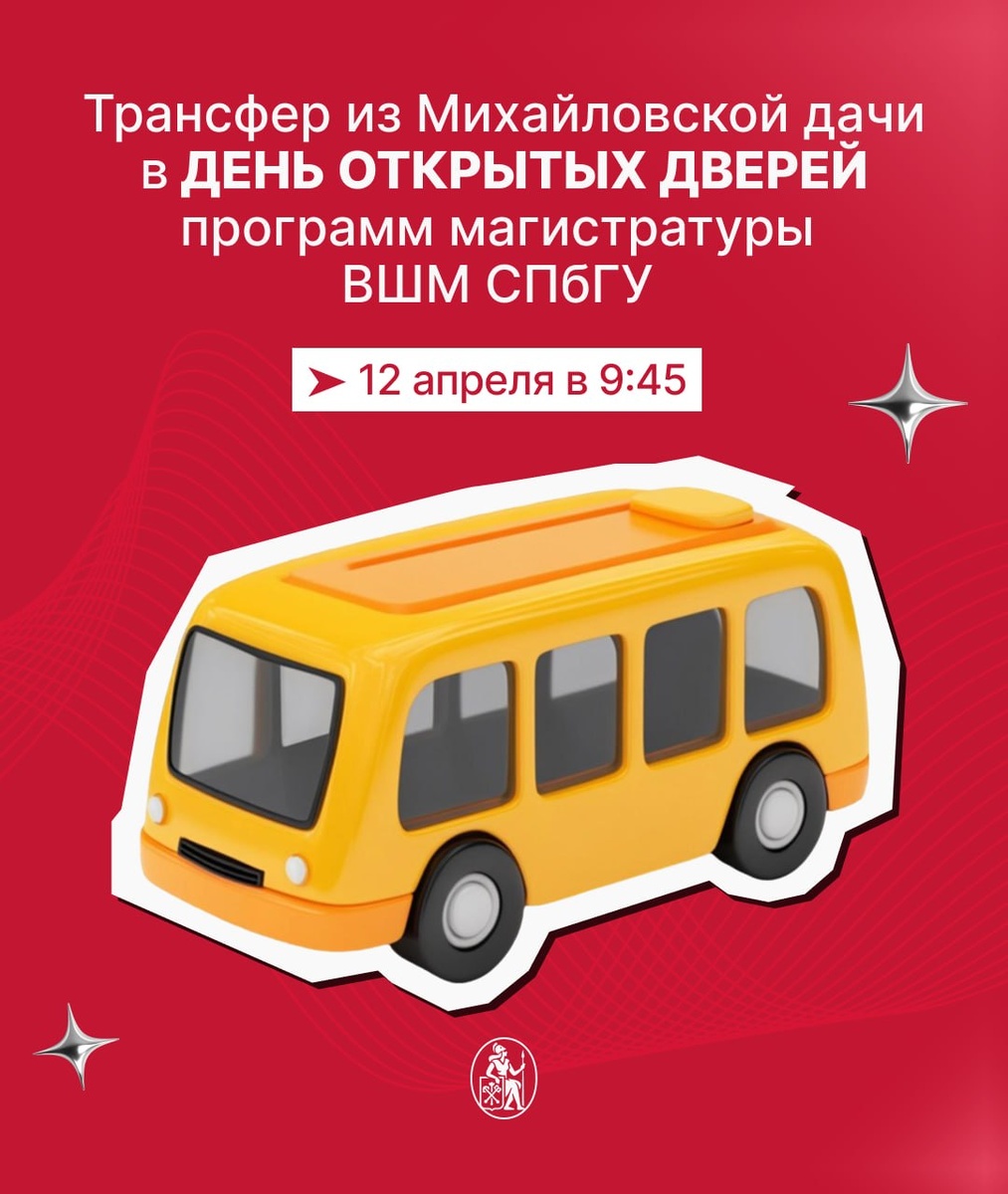 🚌 12 апреля прямо с утра вас будет ждать комфортный трансфер. 📌 Сбор: в 9:45 у Студклуба 📆 Отправление автобуса: в 10:00 от Студклуба Обратный автобус из кампуса на Волховском отправится в 15:00. В этот день не будет никакой лишней логистики, только полезные знакомства, программы и карьерные возможности. 💫 Ждём вас на Дне открытых дверей 12 апреля! 🔗 Регистрируйтесь по ссылке — подробности ищите на сайте 👩 Подписывайтесь на нас в ВК и MAX!