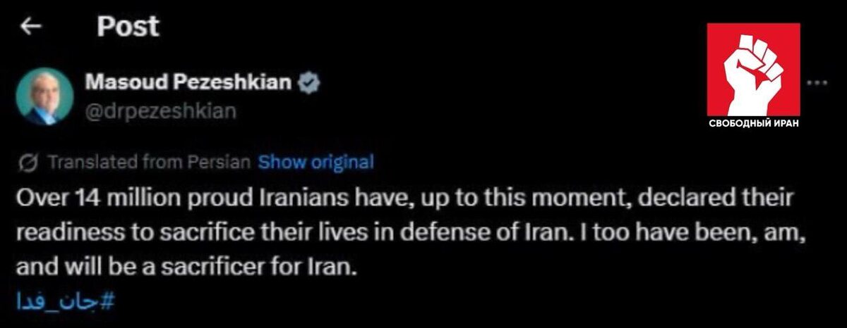 Президент Ирана Масуд Пезешкиан заявил, что более 14 миллионов иранцев готовы отдать жизнь за свою страну. Он также подчеркнул, что сам был, есть и будет готов пожертвовать собой ради Ирана.