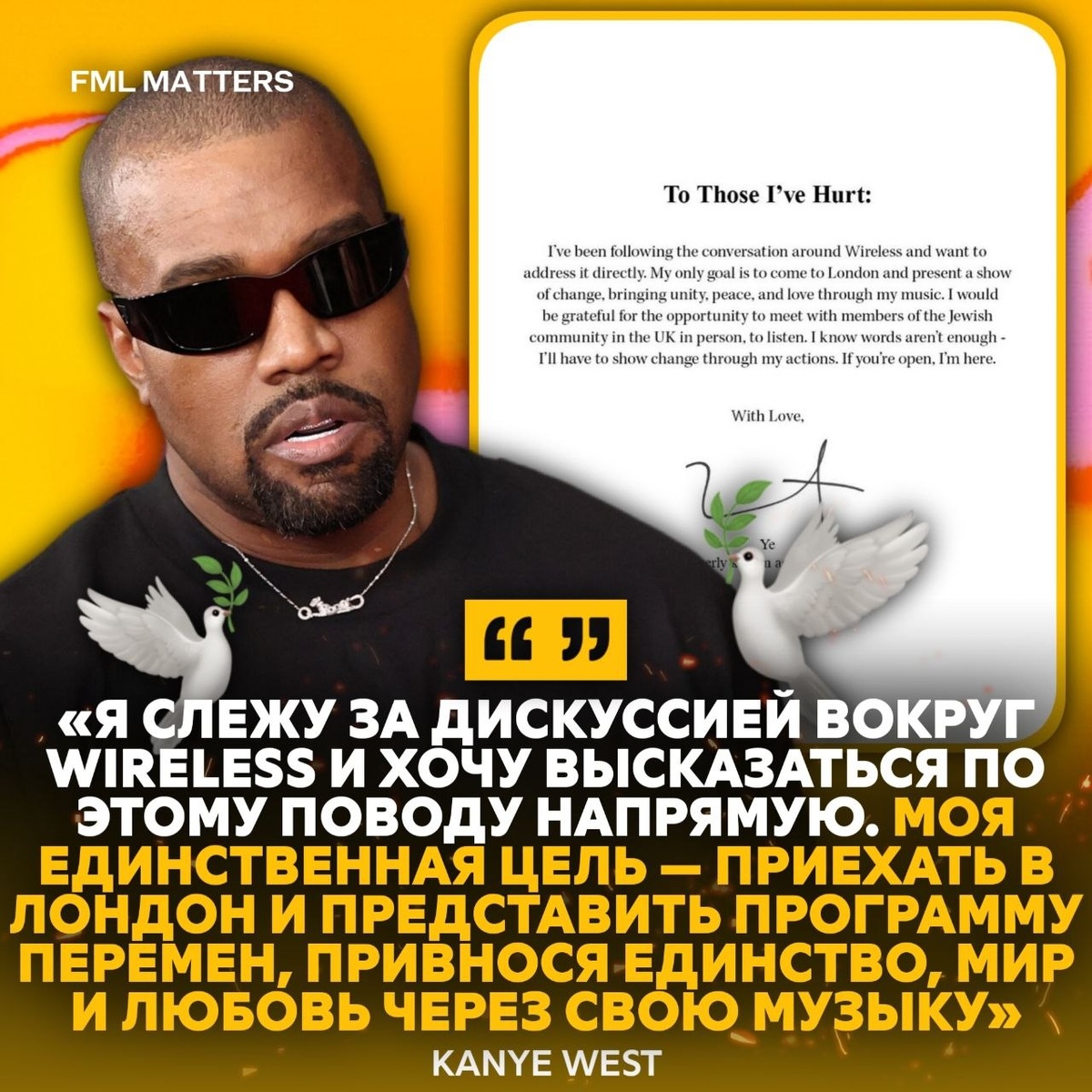 🕊 KANYE WEST ВЫСКАЗАЛСЯ ПОСЛЕ ТОГО, КАК БРЕНДЫ НАЧАЛИ ОТ НЕГО ОТВОРАЧИВАТЬСЯ! После того как бренды начали дистанцироваться от Wireless Festival из-за его участия, Йе опубликовал обращение, в котором заявил, что хочет приехать в Лондон не ради скандала, а чтобы через музыку показать «перемены, единство, мир и любовь». «Я был бы благодарен за возможность лично встретиться с членами еврейской общины Великобритании, чтобы выслушать их. Я знаю, что одних слов недостаточно – мне придётся показать перемены своими действиями. Если вы открыты, я здесь. С любовью, Йе, ранее известный как Канье Уэст», – добавил Йе 💀 FML MATTERS
