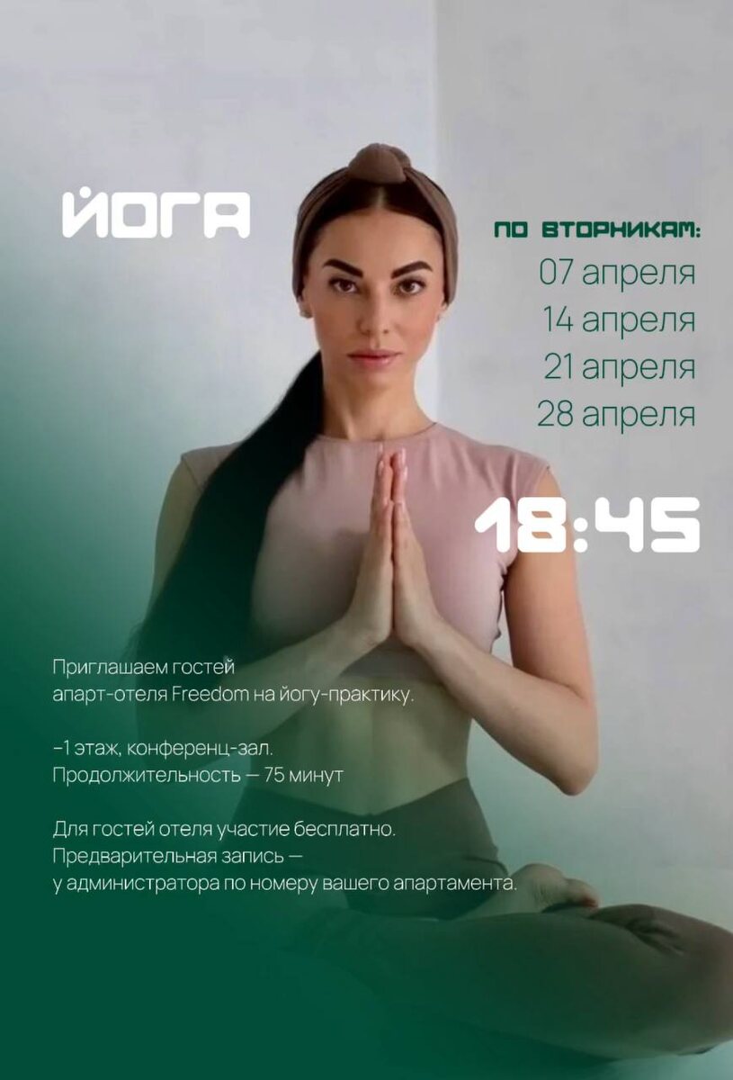 Дорогие гости! Каждую неделю мы создаем для вас островок спокойствия. Ждем вас на йога-практику. 🗓 РАСПИСАНИЕ НА АПРЕЛЬ 📅 7 апреля (вт) 📅 14 апреля (вт) 📅 21 апреля (вт) 📅 28 апреля (вт) 📍 МЕСТО ПРОВЕДЕНИЯ –1 этаж, конференц-зал. Продолжительность занятия — 75 минут. ✨ КАК ЭТО БУДЕТ: Если вы устали от суеты мегаполиса и хотите нырнуть в пространство внутренней тишины, почувствовать своё тело, дыхание, пульсацию жизни в каждой клетке, замедлиться, успокоить ум и сладко потянуться в шавасане в конце занятия — вы по адресу. Это ваш час для глубокого перезапуска. 📋 ПРАКТИЧЕСКАЯ ИНФОРМАЦИЯ ⤵️ • Занятия подходят для взрослых и детей с 8 лет • Любой уровень подготовки • Коврики предоставляем • Приходите в удобной одежде • Ведет практику Йоги Рита 🙏🏻 🎫 УСЛОВИЯ УЧАСТИЯ ⤵️ • Для гостей отеля — бесплатно • Предварительная запись обязательна — обращайтесь к администратору по номеру вашего апартамента Хотите стать нашим гостем и присоединиться к практике? ➡ Бронируйте номер на сай