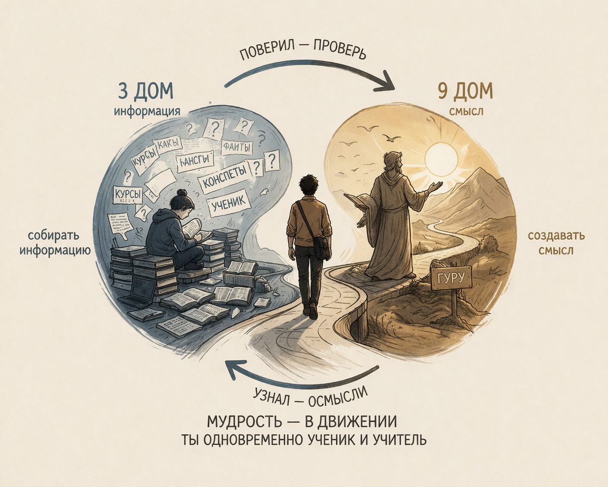 Ты читаешь пятьдесят книг в год — и не можешь сформулировать одну собственную мысль. Или формулируешь — но давно перестал слушать чужие. Оба варианта звучат как достижение, пока не начинаешь присматриваться: в первом случае человек собирает информацию как будто коллекционирует монеты — не чтобы тратить, а чтобы держать в руках и чувствовать их вес. Во втором — он давно решил, что уже всё понял, и теперь только транслирует, не обновляя картину мира. Это и есть ось 3–9 в своих двух крайностях: вечный студент, который никогда не станет мастером, и гуру, который давно перестал быть учеником.