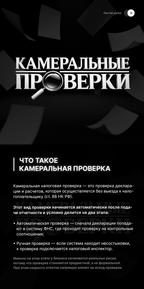 В 2026 году камеральные проверки остаются самым массовым инструментом налогового контроля. С ними сталкиваются все - от индивидуальных предпринимателей до крупных компаний. При этом сама процедура постепенно усложняется и перестает быть формальной. 🔵 Почему камеральную проверку недооценивают Распространенное восприятие - это «обычная проверка декларации». На практике все иначе. Именно в рамках камеральных проверок налоговая служба чаще всего находит ошибки, которые становятся основанием для доначислений. Фокус смещен не на сам факт проверки, а на качество данных, которые уже находятся у налоговой. 🔵 Как проходит камеральная проверка в 2026 году Проверка начинается автоматически и проводится дистанционно. Налоговая анализирует декларации и связанные с ними расчеты. Если в данных выявляются несоответствия, инспекция переходит к более глубокому изучению: запрашивает пояснения, требует документы и фактически расширяет рамки первоначальной проверки. 🔵 Когда ФНС запрашивает докумен