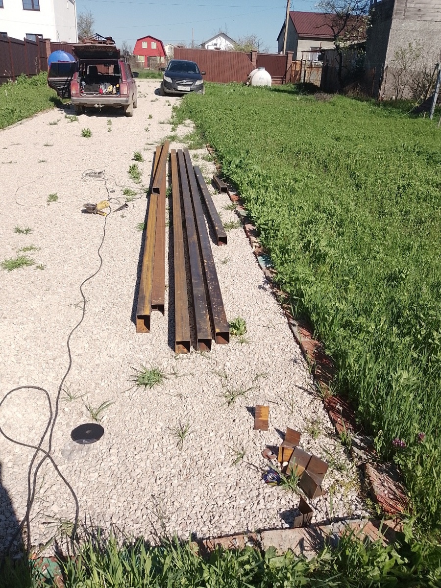 Здравствуйте! Еще один, в этот раз не большой навес. Даже не навес, пристройка к домику бытовке. Люди покупают не большой домик, своя дача на юге, здорово же, домик так, переночевать, основное время будем на море. А помыкавшись в пятнадцати квадратах начинают задумываться. Это уже не в первый раз когда бытовки начинают разрастаться. Вот и мы завезли материал на расширение бытовки. На этом объекте бытовка стоит на плите, плита сразу залита с возможностью сделать веранду открытую, веранда перерастает теперь в закрытую кухню, гостиную. Поэтому несущие, опорные столбы крепим с помощью вот таких ушек, прямо к плите. Для этого используем анкера диаметром четырнадцать миллиметров. крепление надежное, анкера потом уйдут под кафель, или линолеум. Всю конструкцию рассчитали так, что бы она стала продолжением существующей бытовки. Тот же наклон крыши, обшита будет тем же профлистом. Только утепление потолка сделаем на сто пятьдесят, что бы летом было не так жарко. В общем пока наша работа н