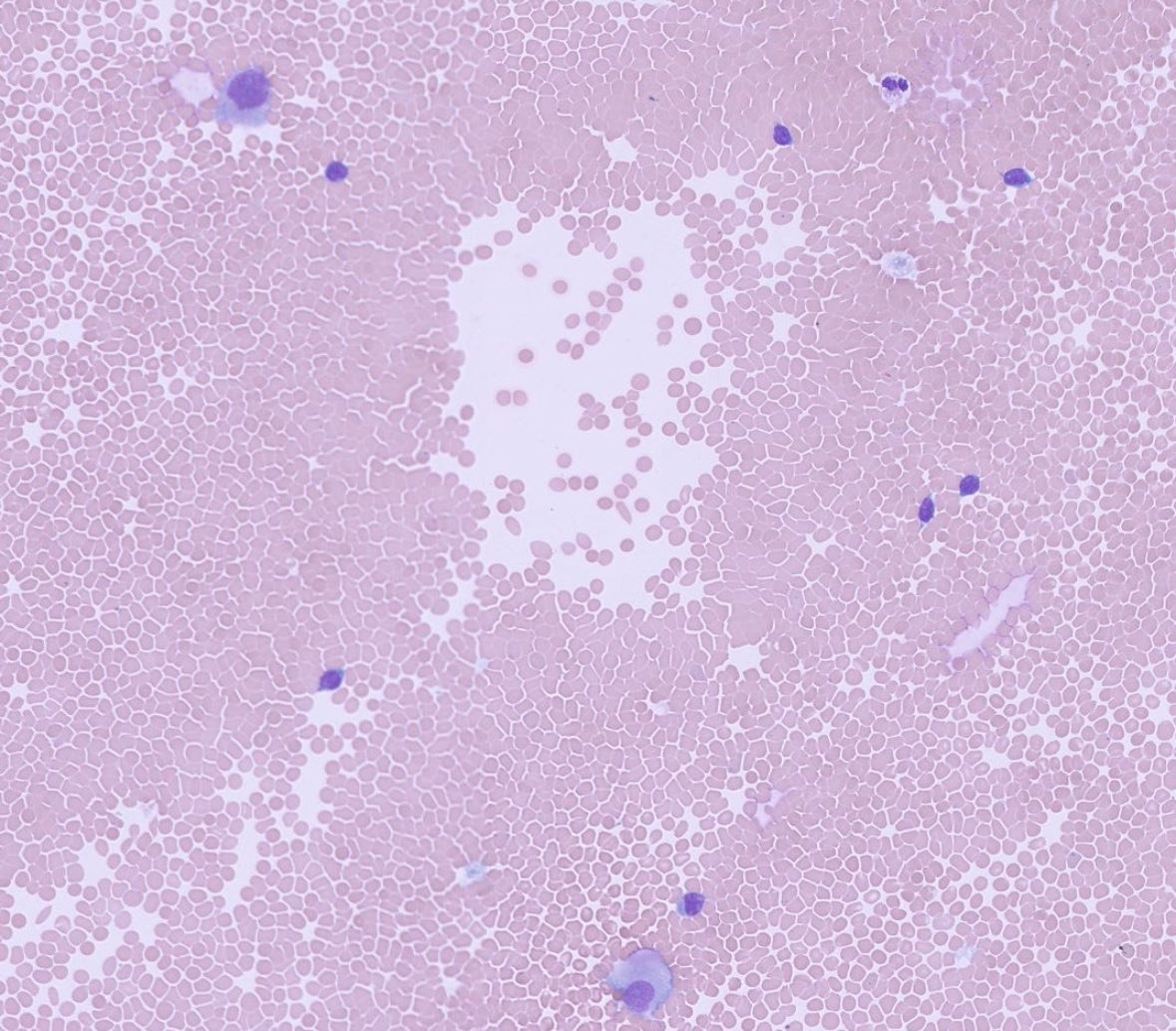 У пациента в анамнезе меланома кожи. Примесь периферической крови в препарате (вследствие травматичной пункции) затрудняет интерпретацию и не позволяет исключить попадание клеток из кровеносного русла. Тем не менее, в препарате обнаружены клетки, содержащие меланиновый пигмент (указаны желтыми стрелками), что требует сопоставления с клинической картиной. #смж #цитология