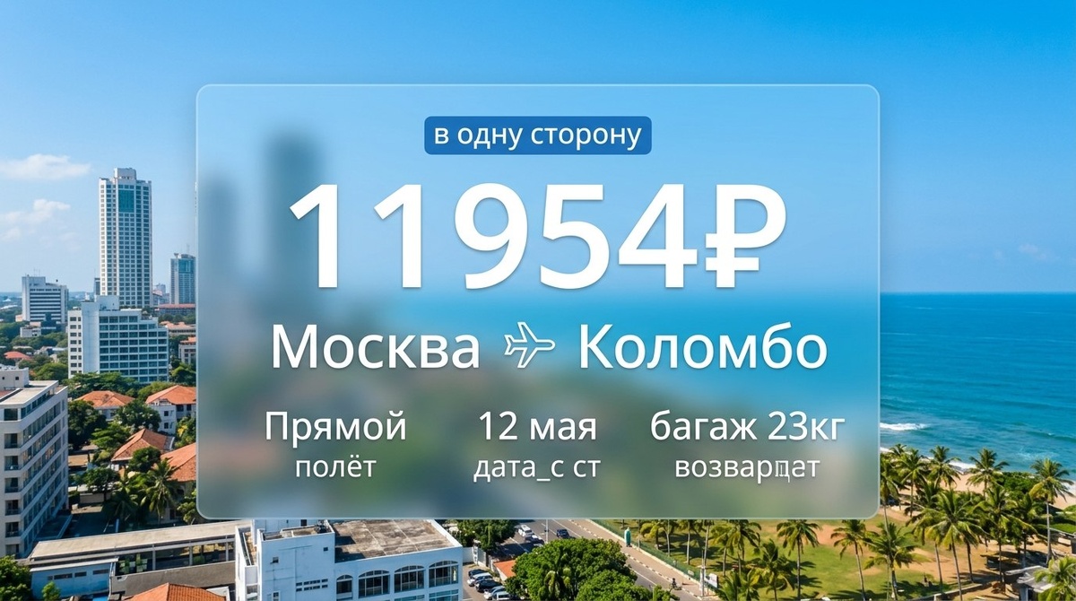 ! • Москва — Коломбо, 12 мая, багаж 23кг — 11 954₽ • Казань — Сочи, 8 апреля, багаж 20кг — 3 536₽ • Санкт-Петербург — Стамбул, 9 апреля, багаж 12кг — 13 874₽ • Екатеринбург — Сочи, туда-обратно с 8 по 19 апреля, багаж 23кг — 9 725₽ • Москва — Казань, туда-обратно с 8 по 15 апреля, багаж 10кг — 7 905₽ Бронируйте места сразу, такие выгодные тарифы долго не живут!