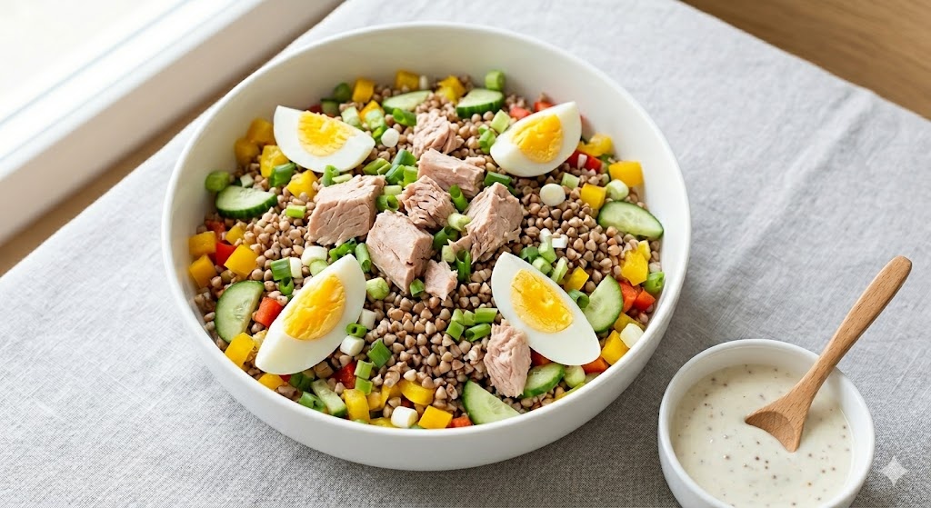 Гречка должна быть тёплой, а не горячей и не холодной. Горячая убьёт свежесть огурца и лука, холодная не возьмёт заправку. Тёплая (40–50°C) открыта: она хорошо впитывает горчично-йогуртовый соус и при этом не «варит» овощи рядом с собой.