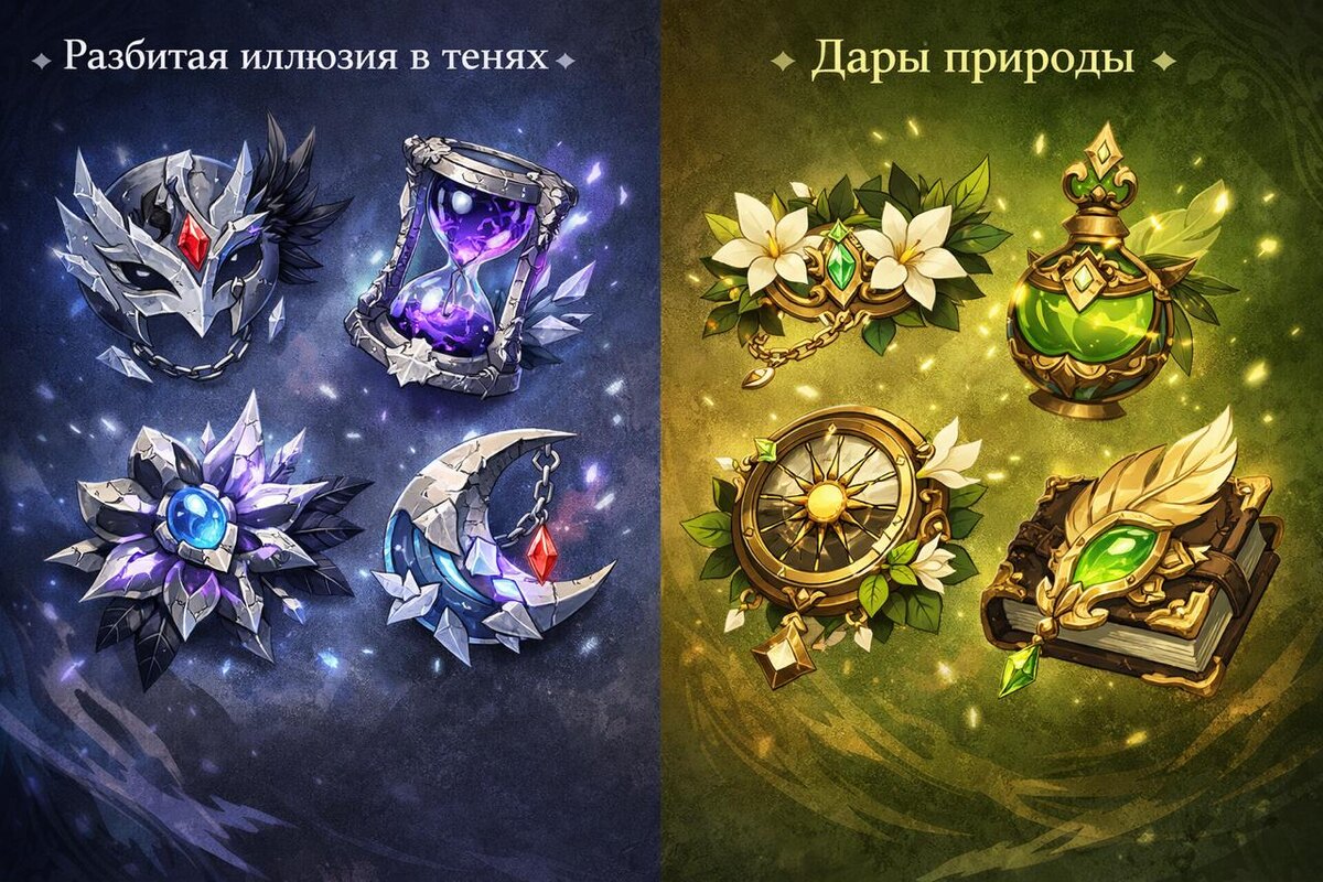 От Seеle появиась инфа по будущим артам: ⚪️ Первый сет — «Разбитая иллюзия в тенях» 2 части: увеличивает силу атаки на 18%. 4 части: урон реакции Сверхпроводник увеличивается на 40%. Когда носитель атакует врага, находящегося под эффектом Сверхпроводника, его крит. шанс для этой атаки повышается на 16% Возможно, в путешествии в Снежную можно будет получить благословение Космоса… ⚪️ Второй сет — «Дары природы» 2 части: увеличивает восстановление энергии на 20% 4 части: если носитель завершил Испытание ведьмы, после использования элементального навыка он получает эффект «Зов небесного света»: в зависимости от элемента носителя, все члены отряда получают бонус 20% к урону соответствующего элемента на 20 секунд Этот эффект может сработать, даже если персонаж не находится на поле боя. Бонусы урона элементов от одинаковых наборов не складываются Если отряд находится под эффектом «Тайного откровения», «Зов небесного света» усиливается до «Гимна мирской славы»: • Дополнительно даётся бону