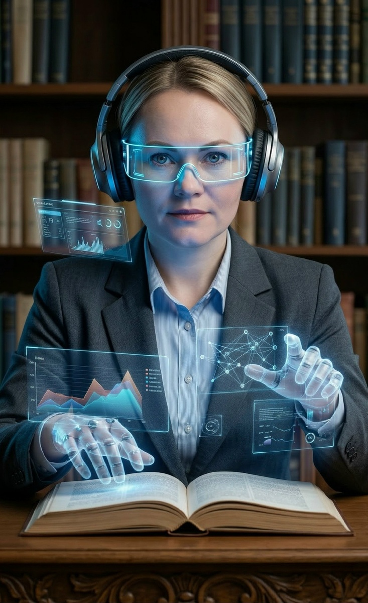 Описание: Не меняя внешности…робот-библиотекарь в зале цифровой библиотеки. Библиотекарь, одетый в элегантный костюм, на голове большие наушники, на лице 3D очки. Руки взаимодействуют с интерактивными дисплеями. На столе лежит раскрытая книга, на заднем плане стеллажи с книгами. Для генерации была использована личная фотография.