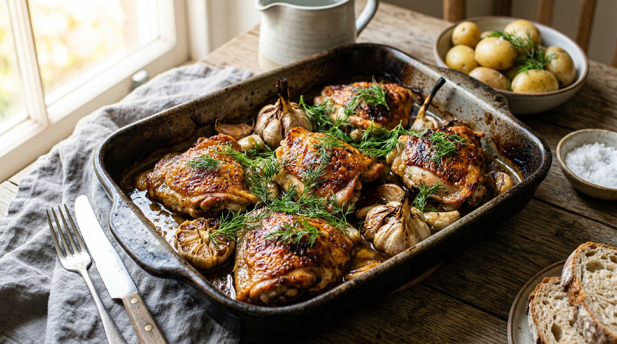 Подавать прямо в форме, поставив её на стол на деревянную доску. К бёдрам идеально подходит простой отварной картофель, в который тоже можно добавить укроп и сливочное масло. Или свежий хлеб, чтобы макать его в те невероятные соки, которые скопились на дне формы — смесь куриного жира, лимонного сока, чесночного масла и мясного сока. Это, пожалуй, самая вкусная часть всего блюда, и за неё в нашей семье идёт настоящая борьба.