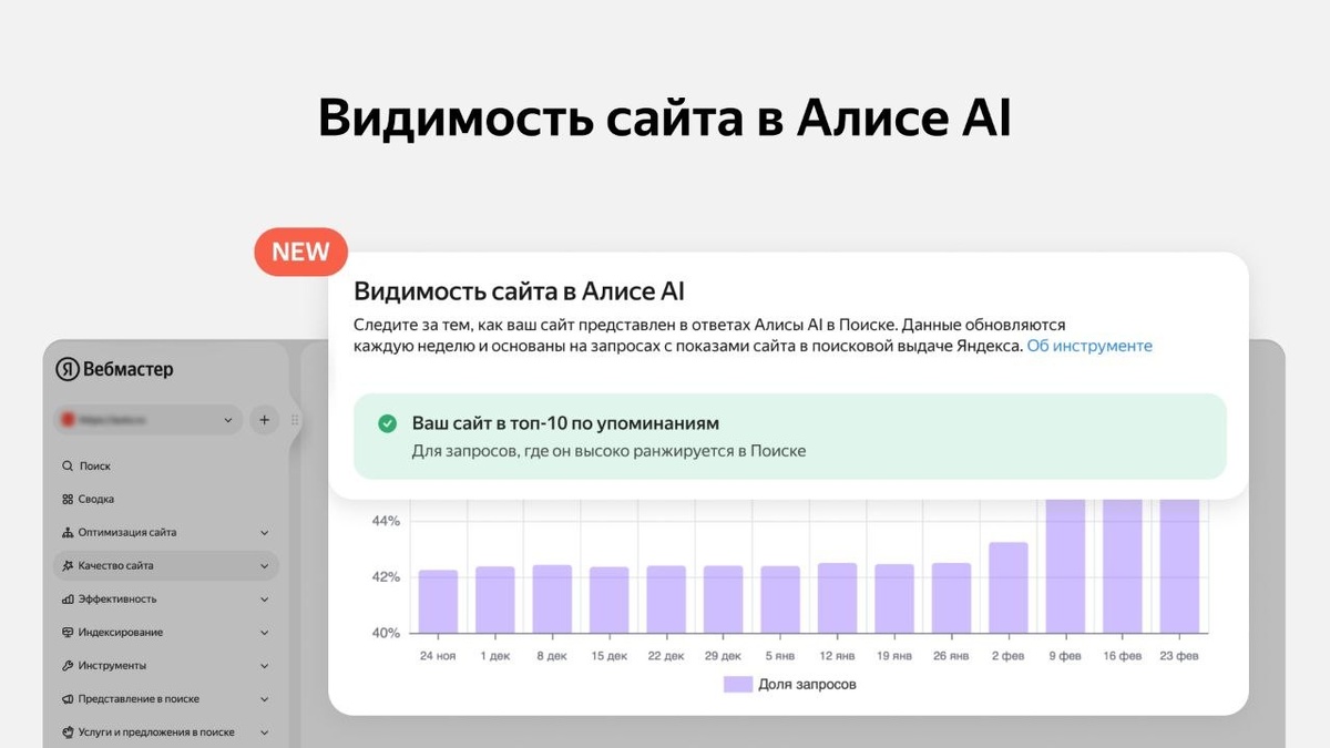 В Яндекс Вебмастере появился новый инструмент — «Видимость сайта в Алисе AI